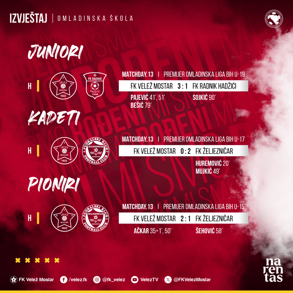Vikend iza nas donio je mečeve u okviru 13. kola Premier omladinske lige Bosne i Hercegovine. Pioniri i Kadeti igrali su svoje mečeve na domaćem terenu protiv ekipe Željezničara. Pioniri su slavili pobjedu rezultatom 2:1, dok su Kadeti poraženi rezultatom 2:0. Juniorska selekcija uspjela je ostvarili vrlo važnu pobjedu. Naši momci su na domaćem terenu savladali ekipu Radnika iz Hadžića rezultatom 3:1.